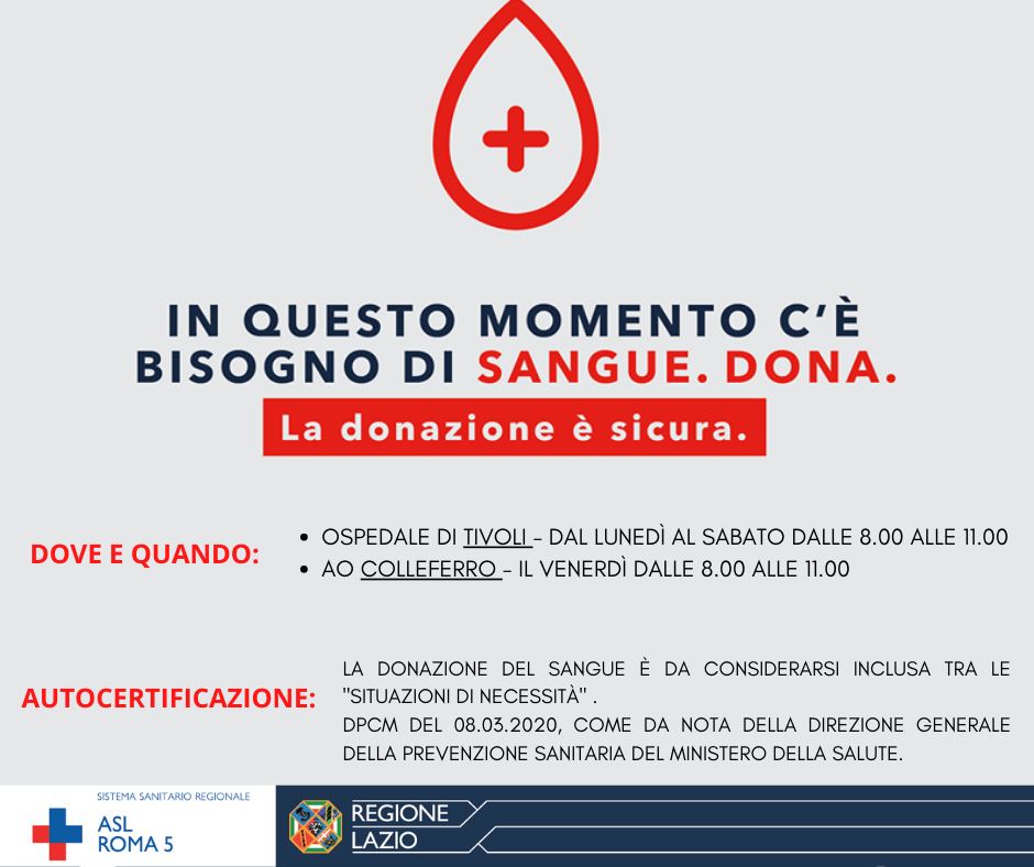 Dove e quando donare: Simt Ospedale di Tivoli, dal lunedì al sabato, dalle 8:00 alle 11:00; AO Ospedale di Colleferro, il venerdì dalle 8:00 alle 11:00.