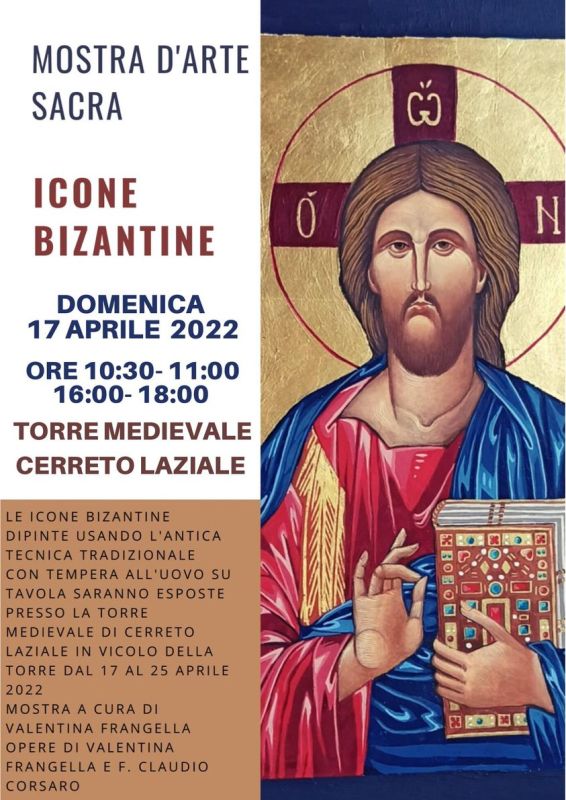 CERRETO LAZIALE – Da Domenica 17 aprile 2022 la Torre Medievale di Cerreto ospiterà una mostra di icone bizantine, realizzate usando l’antica tecnica tradizionale con tempere all’uovo. L’intera esposizione, curata da Valentina Frangella, raccoglie le opere di Valentina Frangella e di F. Claudio.