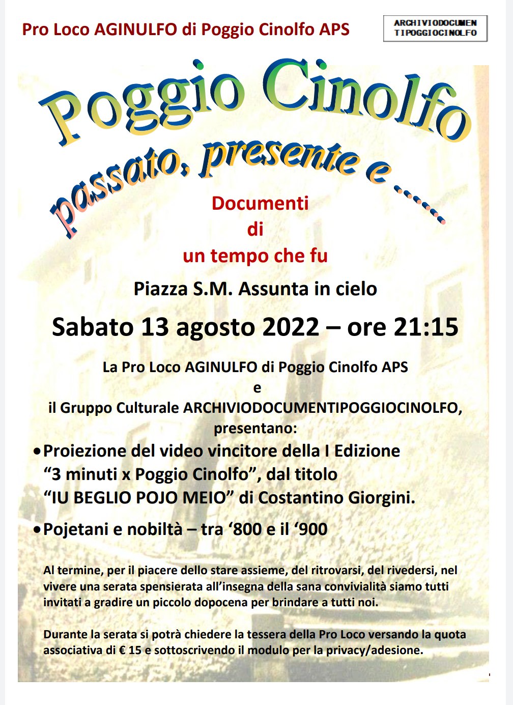 POGGIO CINOLFO – Una interessante iniziativa è stata intrapresa dalla Pro loco Aginulfo con l’evento programmato per sabato 13 agosto 2022 presso la suggestiva cornice della Chiesa di Santa Maria Assunta in Cielo: Poggio Cinolfo, passato, presente e… documenti di un tempo che fu. Un analisi storica culturale da seguire:
