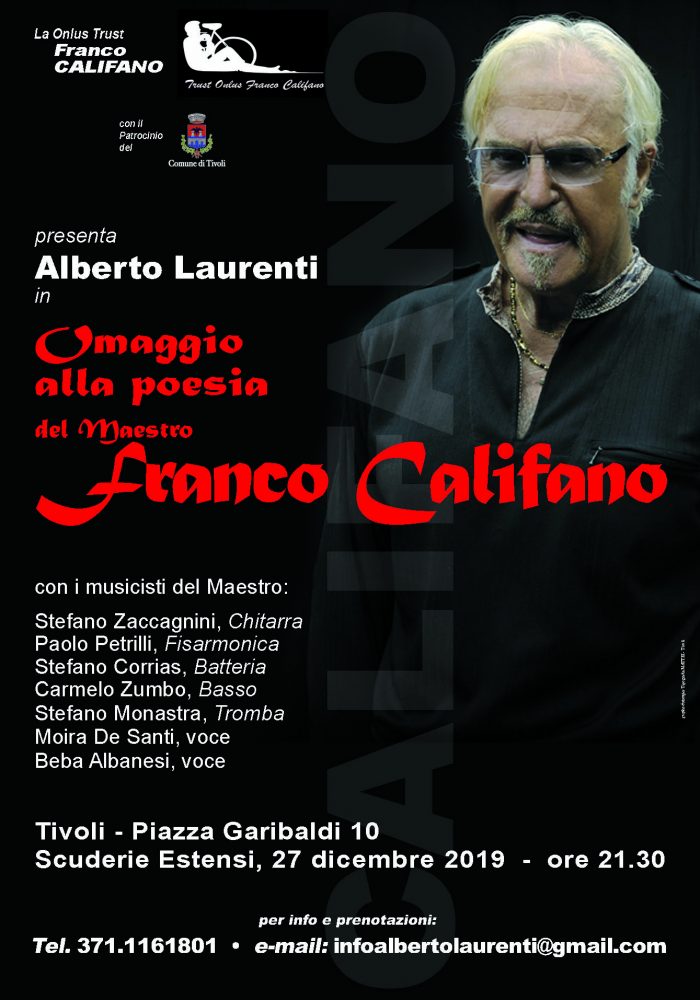 Tivoli – C’è grande attesa per il 27 dicembre 2019 alle ore 21.30, quando presso il Palazzo delle Scuderie Estensi, si svolgerà l’evento “Omaggio alla poesia del Maestro Franco Califano”, un evento per celebrare il quinto anno di vita della Onlus, nata successivamente alla scomparsa dell’artista nel 2013, una serata per raccogliere fondi destinati alla divulgazione della poesia e della canzone del Maestro.