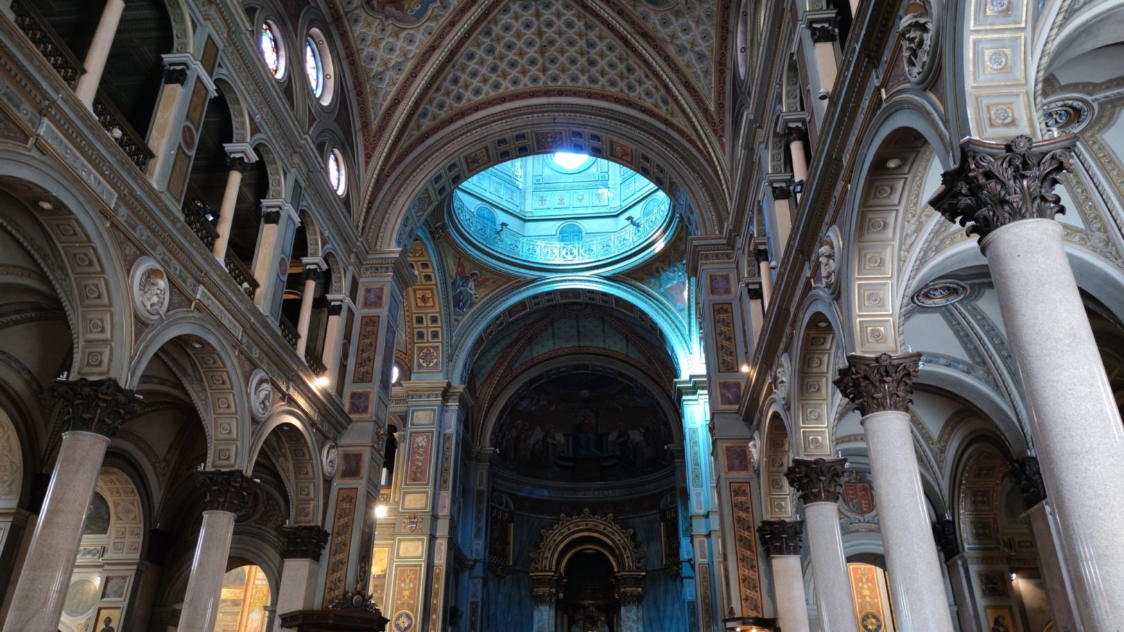 Una volta varcata la porta d’ingresso, la magnificenza della chiesa viene incontro con tutta la sua potenza. Le numerosissime decorazioni parietali in marmo, mosaico, affreschi, ceselli catturano l’attenzione. Il presbiterio è coronato dall’incantevole cupola che mostra all’interno il proprio cielo stellato cosparso di stelle su sfondo turchino.