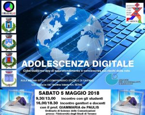 Carsoli – Sabato 5 maggio 2018 sarà una giornata dedicata al problema del cyberbullismo, dei rischi che comporta la rete web e di tanti altri aspetti correlati a questo grande problema sociale. “Adolescenza digitale” è il tema sul quale si svolgeranno gli incontri della giornata che coinvolgeranno gli studenti dell’Istituto Omnicomprensivo Statale di Carsoli durante la sessione mattutina, per poi riaprire i lavori nel pomeriggio dalle ore 16.00 alle 18.30 con incontri aperti a genitori, docenti e a chiunque voglia ascoltare ed approfondire. Relatore d’eccezione sarà il prof. Giammaria de Paulis, ordinario nella facoltà di Scienze delle Comunicazioni presso l’Università degli studi di Teramo, in un contesto di approfondimento, dibattito e centralità delle problematiche. Questo il Contest del cyberbullismo day: “L’uso di internet richiede una maggiore attenzione all’ascolto e alla partecipazione dei ragazzi che non devono essere solo “consumatori” di media ma, a seguito di attività di formazione/informazione, dovranno essere in grado di utilizzarli in modo consapevole e responsabile, acquisendo gli strumenti per comprendere tanto le potenzialità quanto le insidie degli stessi.”