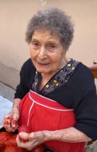 Discreta, laboriosa, a 102 anni prepara ancora la salsa di pomodoro in barattoli, quelle fatte in casa come un tempo.