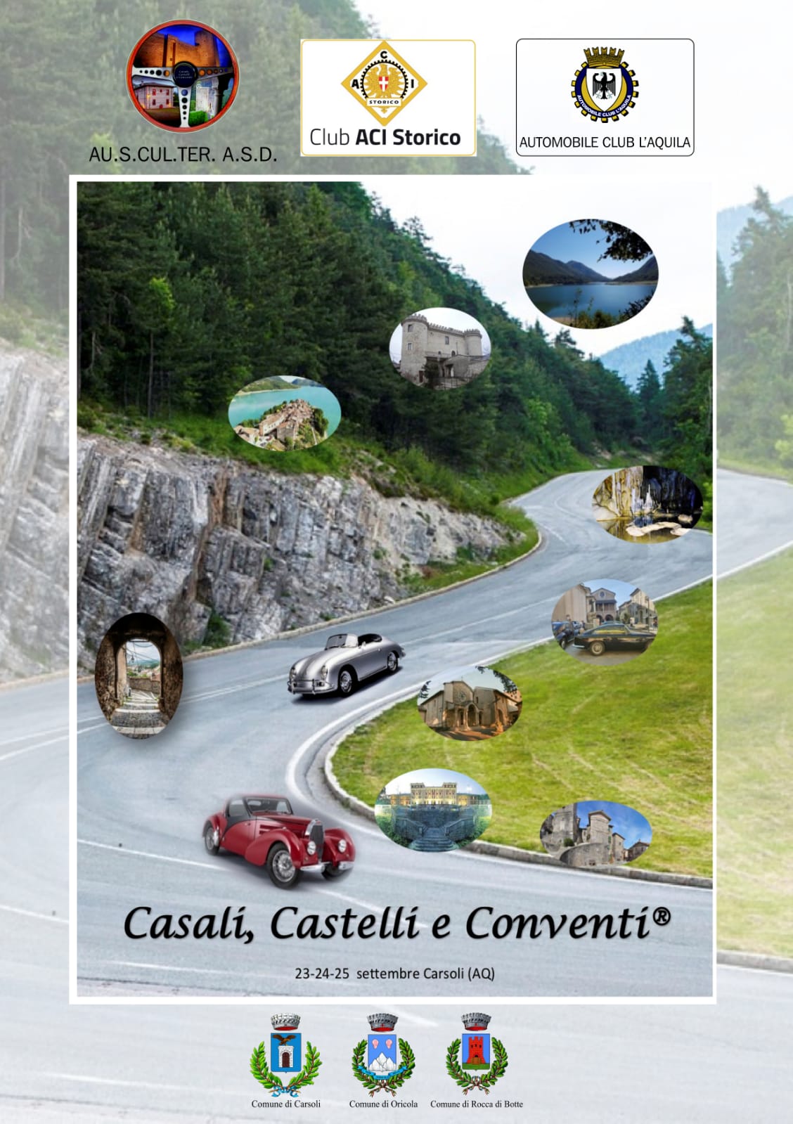 Carsoli – Al via da oggi la tre giorni motoristica di Carsoli Oricola Rocca di Botte e Tagliacozzo. Casali Castelli e Conventi rinnova l’appuntamento con gli appassionati di automobili d’epoca , come ormai di tradizione, per l’ultimo fine settimana di settembre.Nel pomeriggio di oggi ci sarà la visita alle grotte di Pietrasecca ed a seguire Tagliacozzo. Domani, sabato 24, partenza da Carsoli , piazza del municipio alle ore 10,30, poi visita a Rocca di Botte ed a seguire pranzo ad Oricola, intorno alle 12,30.