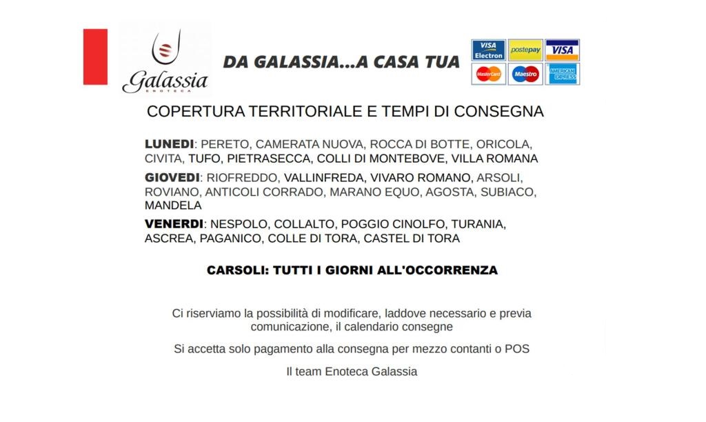 Galassia – Torna in azione la “Galassia di Emergenza“, con “La Galassia a casa tua” un format di consegne prodotti a domicilio in questo difficile momento che sta vivendo il territorio. L’iniziativa è stata già intrapresa nella primavera scorsa da Galassia Enoteca con sede presso la zona commerciale di Carsoli. L’azienda dunque è in grado di soddisfare tutte le esigenze della clientela in ogni dove: