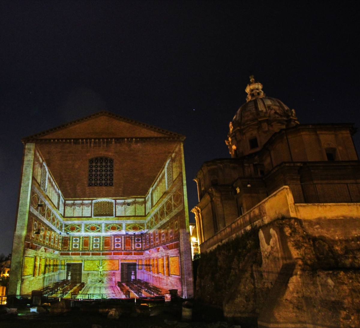 Allo spettacolo al Foro di Augusto si assiste stando seduti su tribune allestite lungo via Alessandrina. Attraverso una multiproiezione di luci, immagini, filmati e animazioni, il racconto di Piero Angela si sofferma sulla figura di Augusto, la cui gigantesca statua, alta ben 12 metri, era custodita accanto al tempio dedicato a Marte Ultore. Con Augusto, Roma ha inaugurato un nuovo periodo della sua storia: l’età imperiale è stata, infatti, quella della grande ascesa che, nel giro di poco più di un secolo, ha portato Roma a regnare su un impero esteso dall’attuale Inghilterra ai confini con l’odierno Iraq, comprendendo gran parte dell’Europa, del Medio Oriente e tutto il Nord Africa. Queste conquiste portarono all’espansione non solo di un impero, ma anche di una grande civiltà fatta di cultura, regole giuridiche, arte. In tutte le zone dell’Impero ancora oggi sono rimaste le tracce di quel passato, con anfiteatri, terme, biblioteche, templi, strade.
