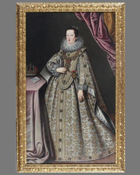 L’opera esposta ritrae Eleonora Gonzaga, figlia minore del duca Vincenzo e di Eleonora de’ Medici, cresciuta nel convento delle orsoline dalla zia Margherita fino al matrimonio con l’imperatore Ferdinando d’Asburgo nel 1622. Un ritratto importante, eseguito in occasione delle nozze della giovane, che la ritrae in vesti maestose, consone al ruolo che andava a rivestire alla corte di Vienna. Eleonora indossa un abito sontuoso di broccato intessuto di fili d’oro e ornato da pizzi, abilmente realizzato dall’artista. Sulla sinistra del corsetto appare un pendente con il monogramma asburgico mentre sul tavolo la corona imperiale e una lettera su cui si legge “alla Sacra Maestà dell’Imperatrice Gonzaga”.