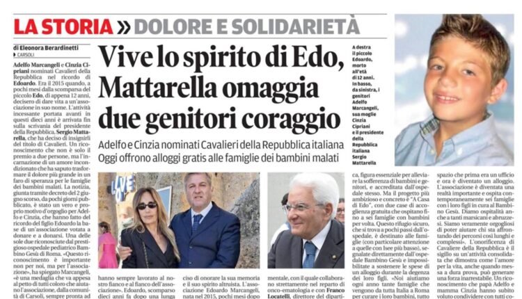 CARSOLI AQ – Il conferimento della nomina a Cavaliere della Repubblica Italiana per Cinzia Cipriani e Adelfo Marcangeli assume un significato del tutto particolare. Avviene a distanza di dieci anni da un epilogo che ebbe allora come oggi a scuotere cuori e coscienze. La repentina scomparsa di Edoardo, un figlio della nostra terra. Un sorriso rubato alla vita che iniziava e che avrebbe dovuto e potuto continuare. L’inesorabilità di una malattia intensa spezzò questa catena, questo cordone di vita che lega genitori, nonni, zii, amici e un pò tutti.