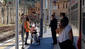 Orbene non sono note le cause per le quali il treno non si sia fermato al binario n.1 per far scendere regolarmente la ragazza. Sta di fatto che una volta scesa la giovane è rimasta bloccata nel marciapiede tra il treno e gli altri binari senza potersi più muovere. Il capotreno, ha avvertito i servizi sociali che prontamente sono arrivati per prestare assistenza e quindi accompagnare la ragazza con un trasporto a braccio. Molti passeggeri si sono anche fatti volontari per dare una mano. Ma la normativa vieta l’attraversamento dei binari. Il capotreno in tale situazione non ha fatto ripartire il convoglio non volendo lasciare la giovane sola in quella situazione. Ci sono voluti 35 minuti per consentirle di raggiungere la stazione utilizzando le scale dei sottopassaggi con l’aiuto di volontari del soccorso. A questo punto il treno è ripartito normalmente. I viaggiatori, pur portando pazienza per una situazione particolarmente delicata, non hanno però risparmiato critiche per la mancata fermata al binario numero 1.