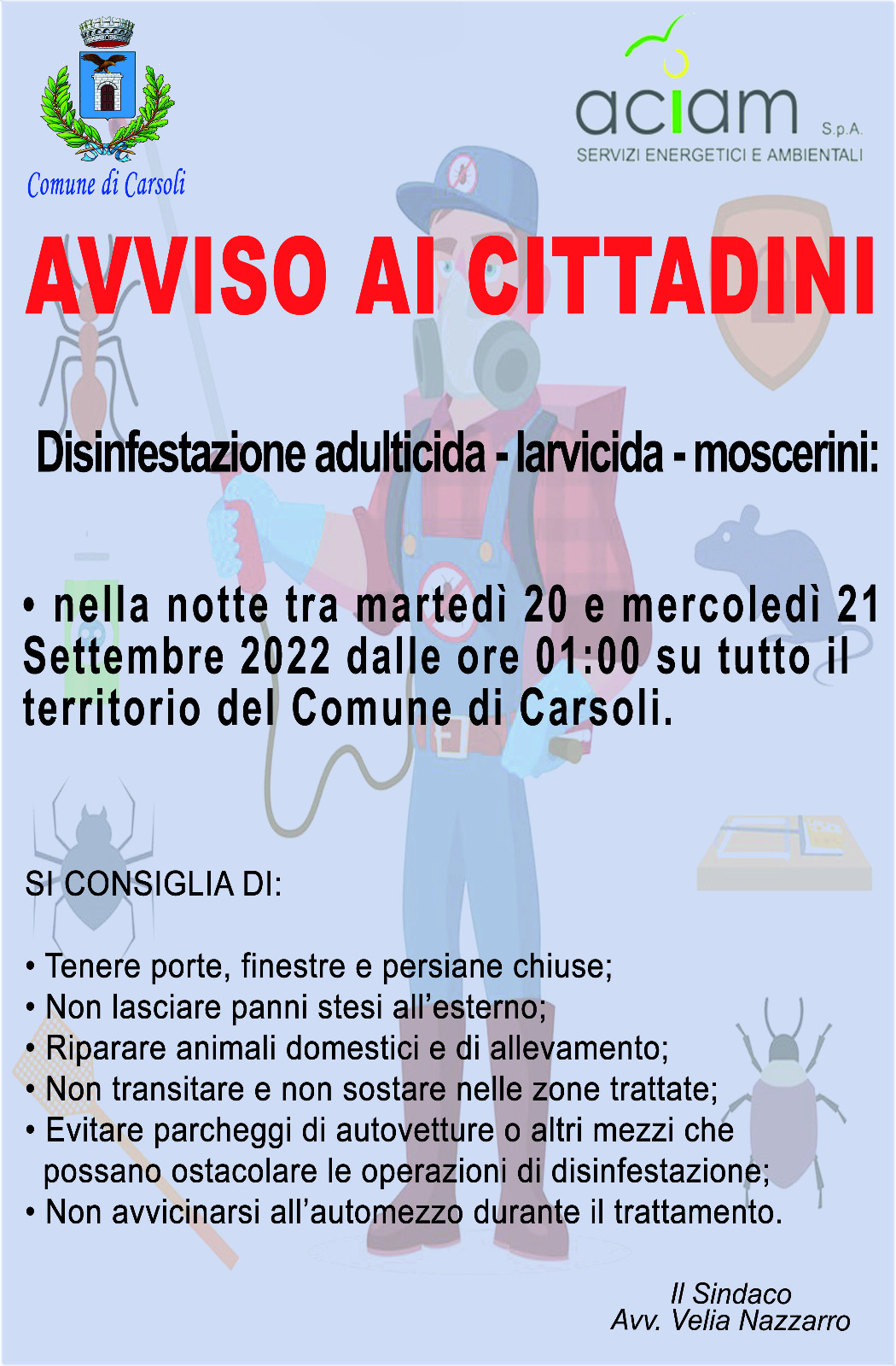 Carsoli – Di seguito il dettaglio relativo alla disposizione di disinfestazione generale del territorio comunale:
