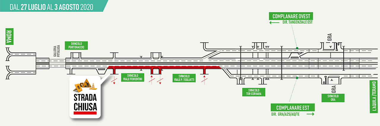interdizione della circolazione delle due corsie (marcia lenta e veloce) tra gli Svincoli di Via F. Fiorentini e Viale Togliatti (dalla progr. km 5+500 alla progr. km 2+286) con chiusura al traffico, sia in entrata che in uscita, degli Svincoli di Via F. Fiorentini e Viale P. Togliatti; la corsia di sorpasso rimane regolarmente percorribile per raggiungere la Complanare Est, lo Svincolo di Tor Cervara, lo Svincolo del GRA e la carreggiata est dell’autostrada A24; per accedere alla carreggiata est del TPU sarà possibile utilizzare lo Svincolo di Portonaccio e le rampe della Tangenziale Est;