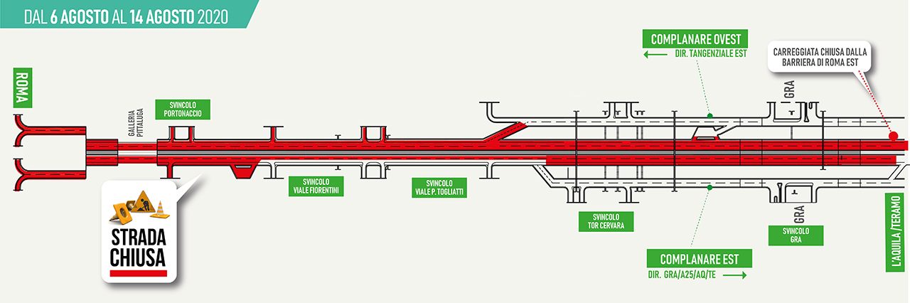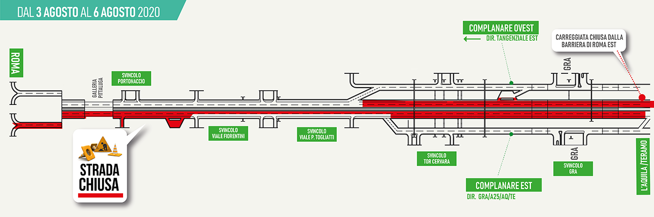 interdizione della circolazione nel tratto di autostrada A24 compreso tra l’imbocco della Complanare Ovest (progr. km 6+400 c.ca), che risulta fruibile, e la progr. km – 4+300 c.ca del TPU, in corrispondenza della confluenza tra la Complanare Ovest ed il TPU;
