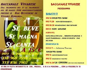 Vivaro Romano – Una interessante iniziativa prende il via domani sabato 17 a Vivaro Romano. Il Baccanale Vivarese, convivialità amicizia e buongusto con “Se beve, se magna e se canta”. Una occasione per vivere insieme la realtà del bellissimo borgo con le varie iniziative che si articoleranno durante il programma delle due giornate.