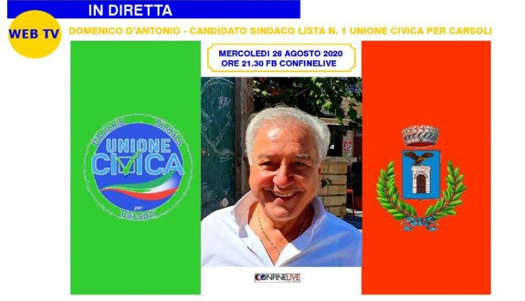 ELEZIONI 2020 – Questa sera Mercoledì 26 Agosto 2020 alle ore 21,30 sulla web Tv di Confinelive sarà in diretta Domenico D’Antonio, candidato sindaco della lista “Unione Civica per Carsoli.