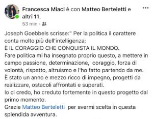 “Francesca Miaci, candidata a Subiaco (RM) nella lista “Sguardo al futuro” per Berteletti sindaco, sul suo profilo facebook cita una frase di Goebbels per rendere chiara la sua ascendenza nazista (salvo poi cancellare il post quando qualcuno le avrà fatto notare “l’inopportunità” del gesto). Non può essere uno scivolone, anche un analfabeta funzionale o di ritorno in cerca di aforismi su google avrebbe capito l’enormità e la gravità nello scegliere tale “autore”. La frase di per sé è sincera e rivelatrice: “per la politica il carattere conta più dell’intelligenza”, infatti di intelligenza la Miaci ne ha dimostrata ben poca.