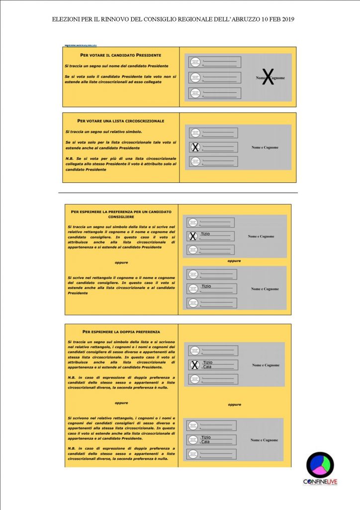 collegate è nullo. Il voto espresso per più liste collegate a candidati Presidente diversi è nullo. Espresso il voto, la scheda deve essere ripiegata e consegnata insieme alla matita copiativa. Il Presidente del seggio accerta che la scheda restituita sia piegata correttamente e la deposita nell’urna. Le rappresentazioni grafiche contenute nel presente manifesto sono mere esemplificazioni delle modalità con le quali si esprime il voto e non riproducono fedelmente il modello della scheda elettorale previsto dall’art. 8 della legge regionale 2 aprile 2013, n. 9.