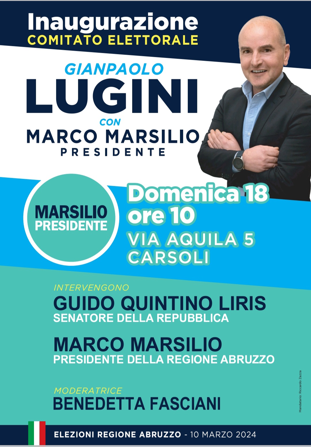 CARSOLI – L’appuntamento è per domenica 18 febbraio 2024 alle ore 10.00 in via L’Aquila: Gianpaolo Lugini vice sindaco di Carsoli e candidato alle elezioni regionali dell’Abruzzo con la lista Marsilio Presidente inaugura il comitato elettorale. All’incontro sarà presente il governatore Marsilio, il senatore Guido Liris, modera l’evento: Benedetta Fasciani.