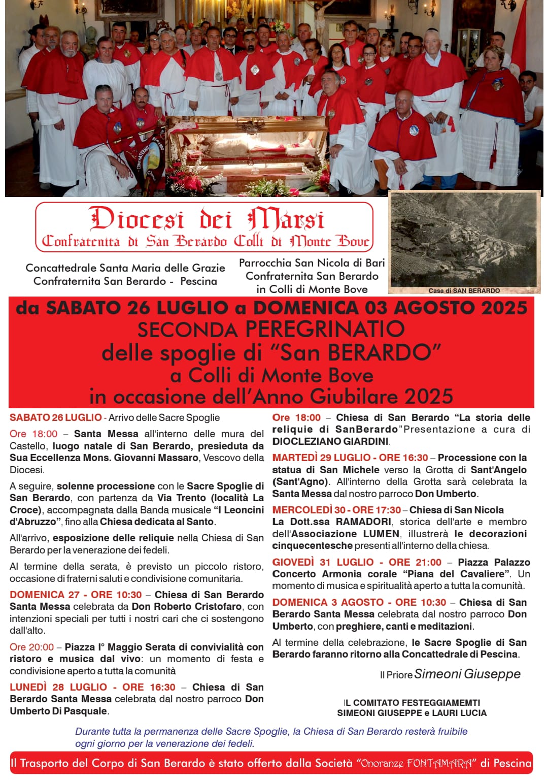 COLLI DI MONTE BOVE – Al via a Colli di Monte Bove la Peregritario di San Berardo. Le spoglie mortali del Santo nativo di Colli tornano per la seconda volta in forma ufficiale in paese. Emozioni all’arrivo, il Santo accolto dalla banda e dalle confraternite. Ciò avviene in occasione dell’anno giubilare, a Colli resterà fino al 3 agosto con un susseguirsi di iniziative. Presente il Vescovo di Avezzano S. E. Mons. Giovanni Massaro il quale durante l’omelia ha ripercorso la vita del Santo che lega da sempre in tradizione e fede le comunità di Colli e di Pescina.