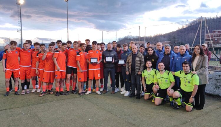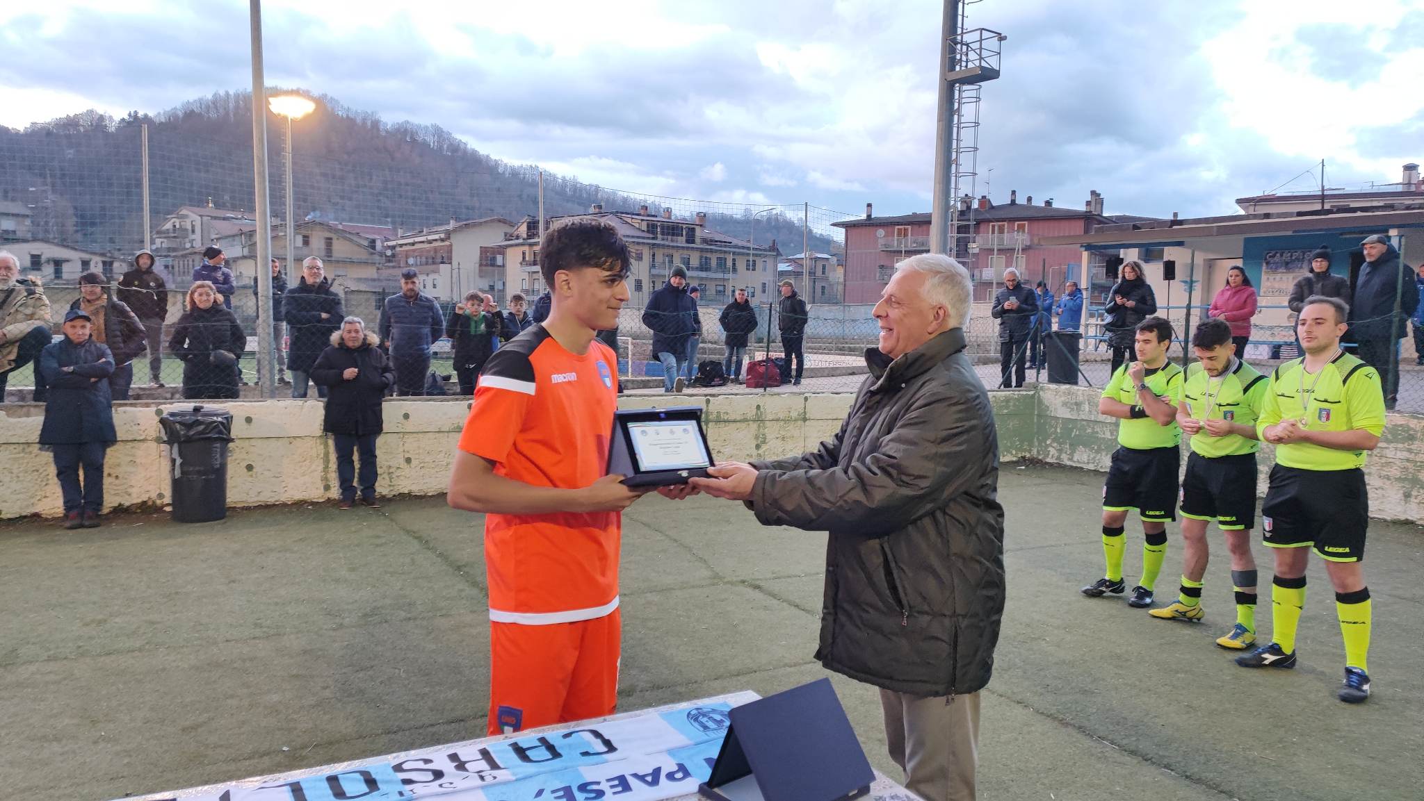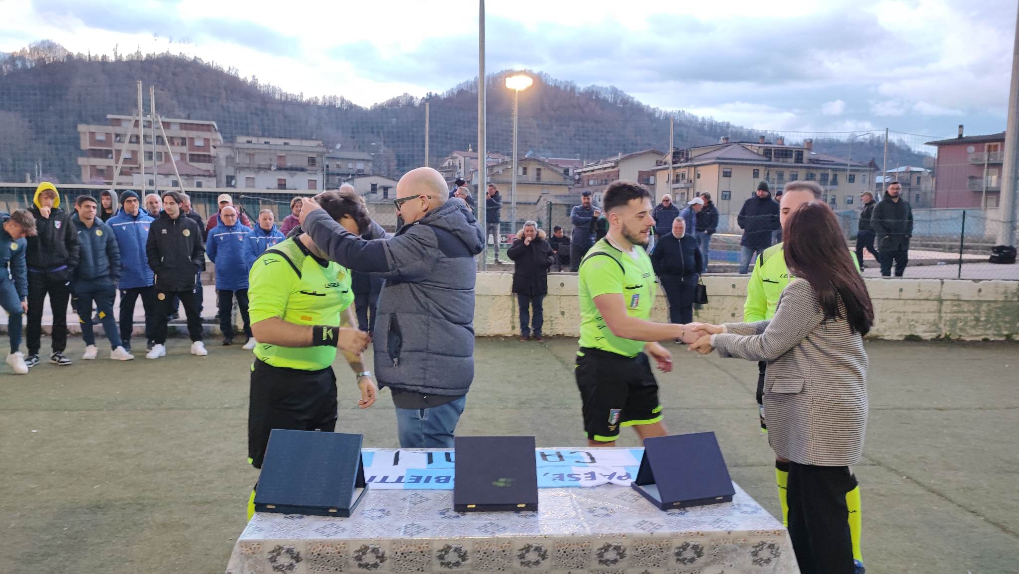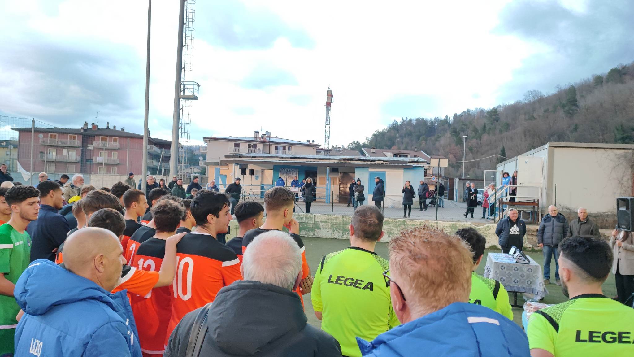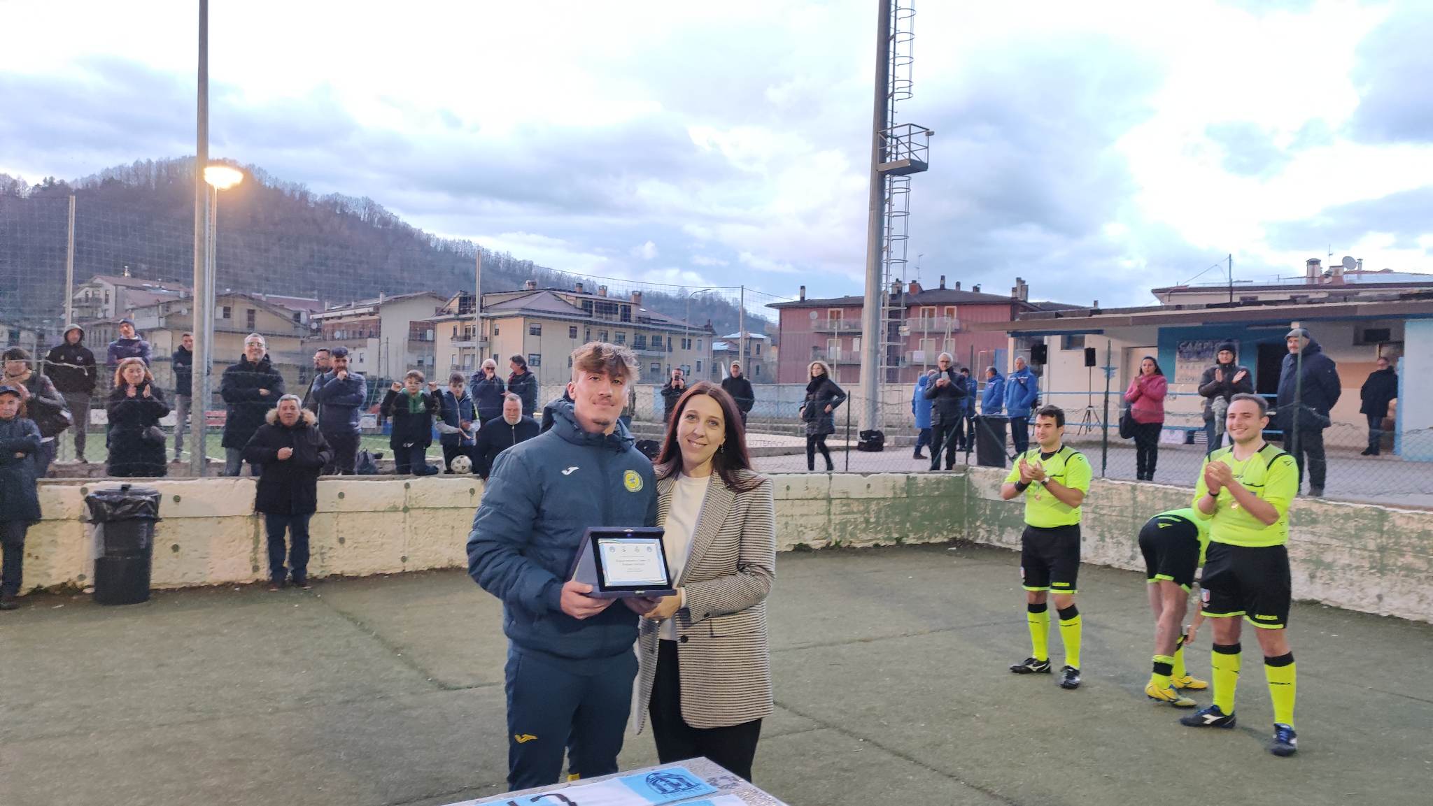 CARSOLI – Giornata entusiasmante vissuta all’insegna dello sport. Prima la disputa delle rappresentative Lega Calcio Lazio Abruzzo Under 15 e a seguire una combattuta ed energica partita con le squadre delle contigue regioni Lazio Abruzzo Under 19. Al termine del primo incontro si è svolta una sobria cerimonia di consegna targhe in ricordo di Edoardo Marcangeli (clicca qui per leggere l’articolo) ed al termine del secondo incontro con la presenza del sindaco Velia Nazzarro si è svolta la consegna targhe finale. La Lega Lazio Abruzzo ha consegnato la targa in ricordo di Edoardo Marcangeli al padre Adelfo, mentre la Asd Carsoli ha consegnato targhe ai tre arbitri in campo per mano del presidente e del dirigente Marco D’Alessandro.