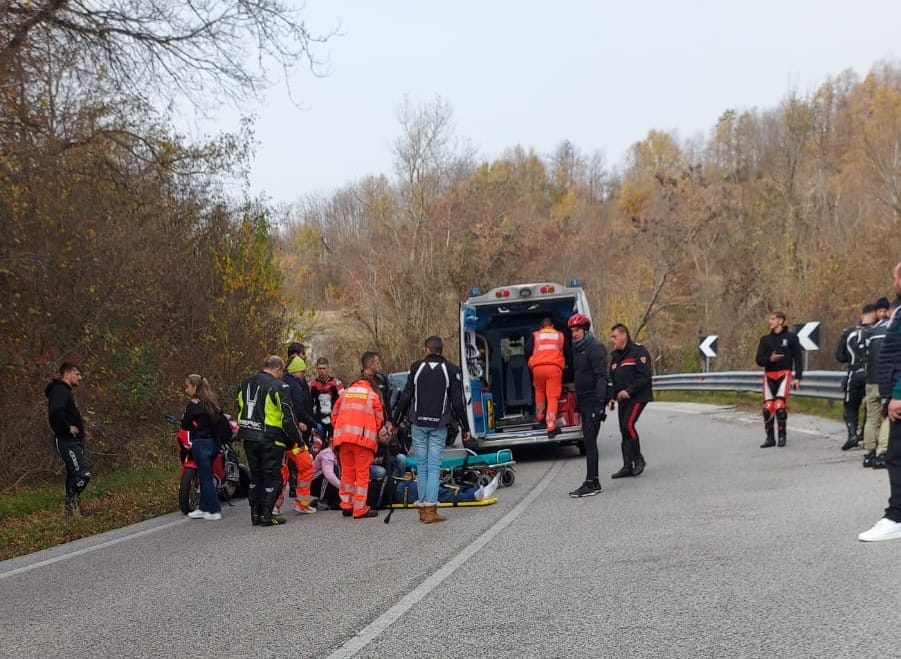 Proprio nel tratto in prossimità dello svincolo per la frazione di Castelvecchio, per cause ancora da accertarsi, uno di questi ha sbandato con la sua moto finendo a terra.