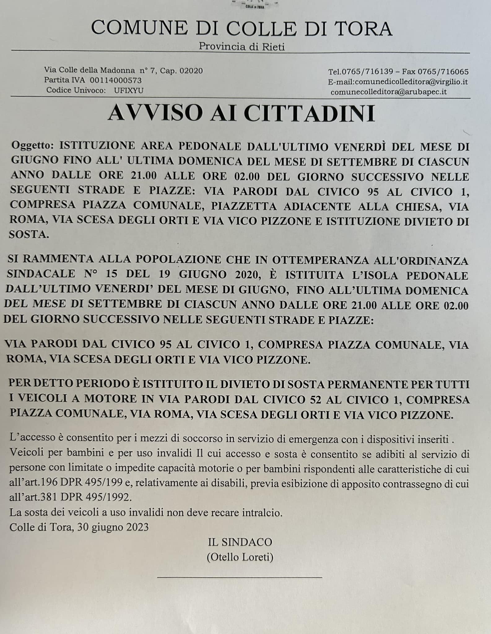 Colle di Tora – E’ stata disposta dal comune l’isola pedonale nel comune di Colle di Tora durante il periodo estivo. Di Seguito il testo integrale dell’ordinanza: