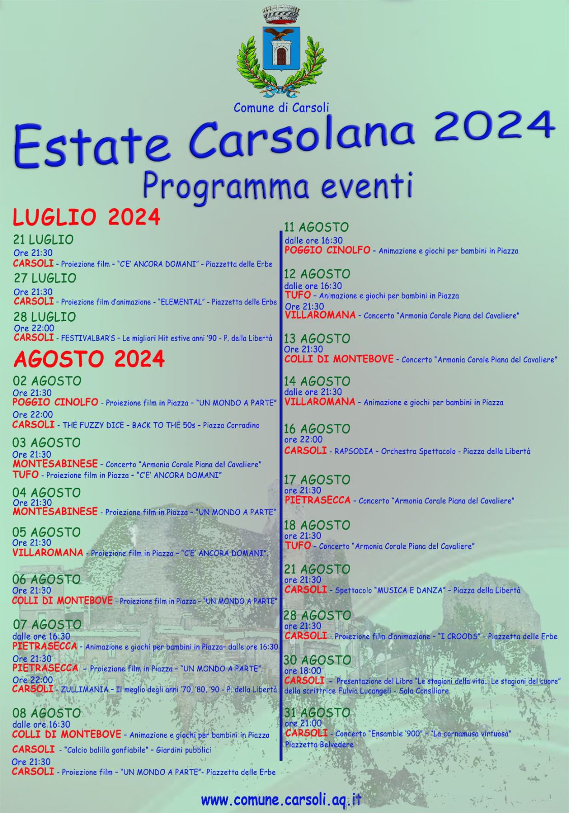CARSOLI – Il comune di Carsoli ha reso noto ufficialmente il programma dell’Estate Carsolana 2024. Ieri sera prima d’eccellenza con la proiezione de film “C’è ancora domani” con Paola Cortellesi. Il sindaco Velia Nazzarro invita tutti a partecipare. A seguire tutte le iniziative di cui in dettaglio: