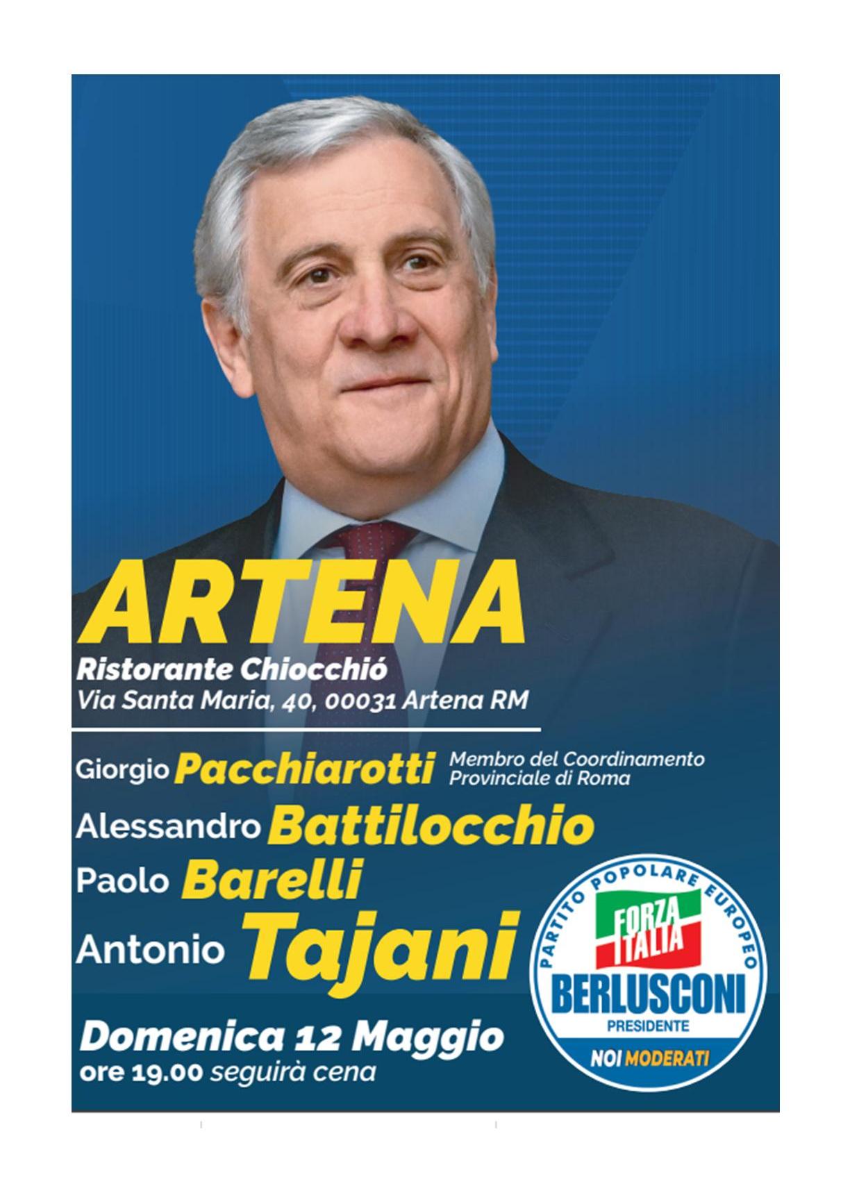 ROMA – Il tema delle elezioni europee sta coinvolgendo un crescente numero di persone. In Forza Italia il Ministro degli esteri Antonio Tajani è candidato capolista in gran parte delle circoscrizioni italiane. C’è grande attesa ad Artena per l’incontro conviviale di Domenica 12 Maggio 2024. Appuntamento alle ore 19.00 presso il ristorante Chiocchiò. I lavori saranno introdotti da Giorgio Pacchiarotti (Sindaco di Jenne), membro del Coordinamento provinciale azzurro di Roma, a seguire Alessandro Battilocchio, Paolo Barelli e l’intervento conclusivo di Tajani. Si concluderà una conviviale con spettacolo.