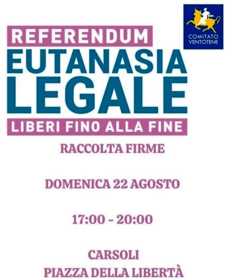 Carsoli – Sarà attivato un infopoint a Carsoli con raccolta firme per Domenica 22 Agosto 2021 dalle ore 17 alle ore 20.00. L’appuntamento è in piazza della Libertà dove sarà disponibile materiale informativo predisposto dal Comitato Ventotene.  Ad autenticare le firme sarà l’Avvocato Eva Ciocci. Lo rende noto il gruppo Eutanasia Legale Marsica in una nota.