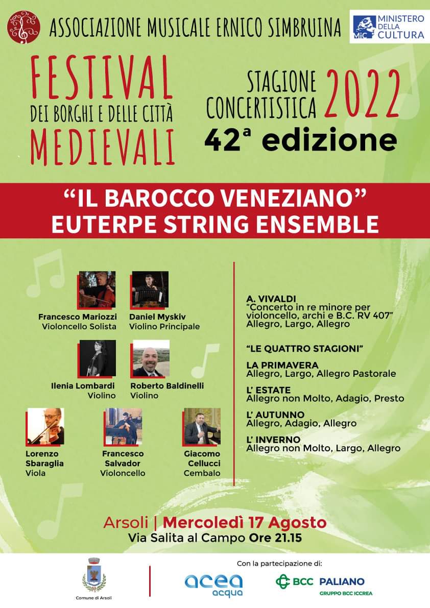 ARSOLI – Prosegue la stagione concertistica del Festival delle città medievali, ad Arsoli grande attesa per l’appuntamento di Mercoledì 17 Agosto 2022, in via Salita al Campo alle ore 21.15. Di seguito il dettaglio evento: