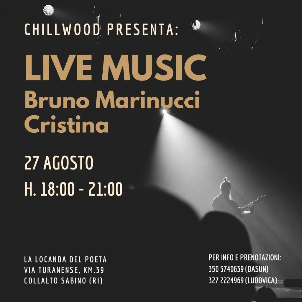 ed il duo Bruno Marinucci Cristina. Un progetto acustico che trova Cristina Greco alla voce e Bruno Marinucci alla chitarra acustica e alla voce. Il duo propone un repertorio di successi internazionali riarrangiati in chiave unplugged spaziando da Sting a Amy Winehouse a Chavela Vargas toccando diversi dei grandi autori. La formula è quella del duo acustico dove l’equilibrio si svolge tra voce e chitarra acustica per una proposta originale degli arrangiamenti dei brani.