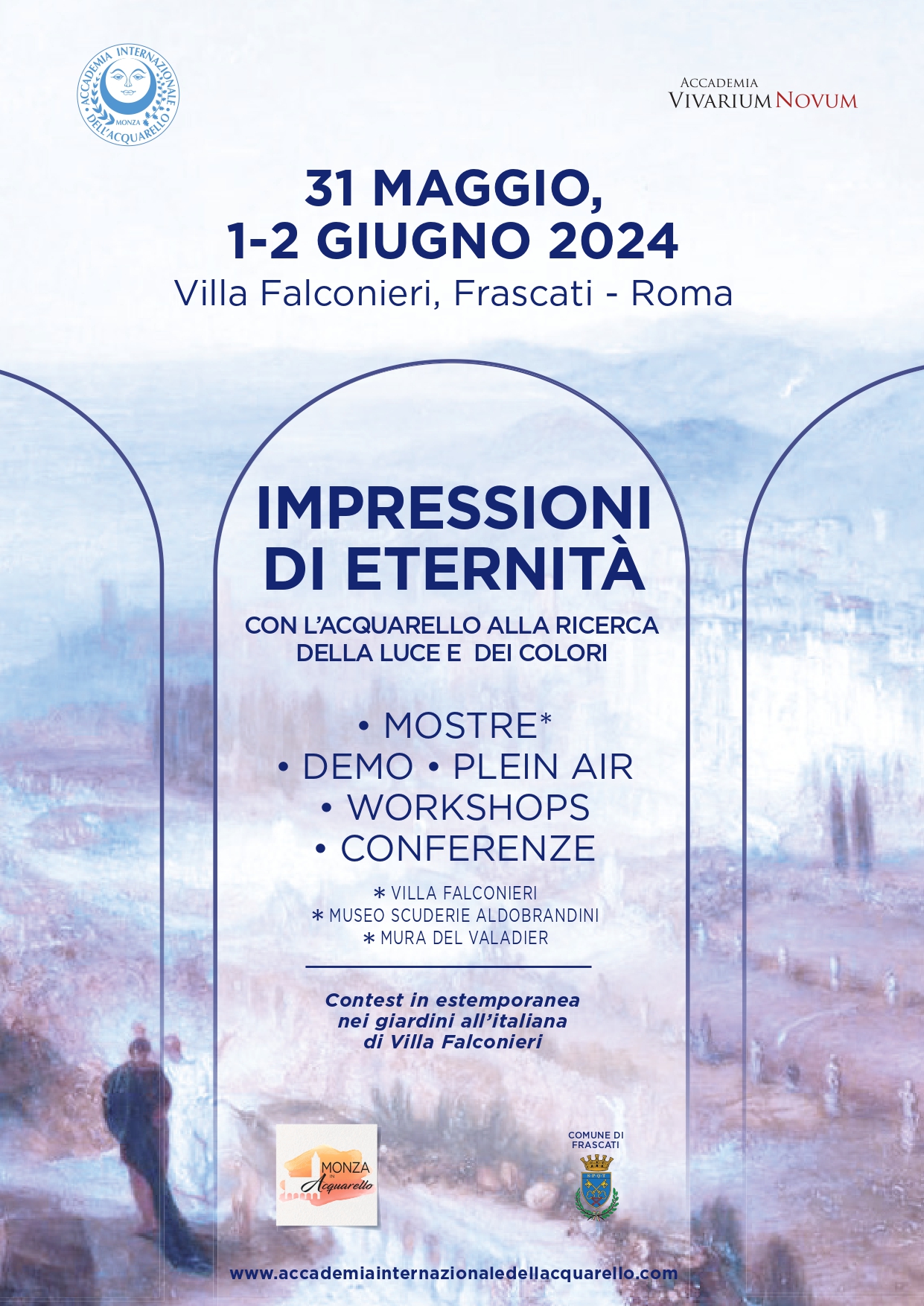 Frascati – Dopo il successo dell’edizione 2023, Frascati ospiterà anche quest’anno l’esposizione internazionale di pittura ad acquarello, curata dall’Accademia Internazionale dell’Acquarello e dall’Accademia Vivarium Novum, dal titolo “Impressioni di eternità”.
