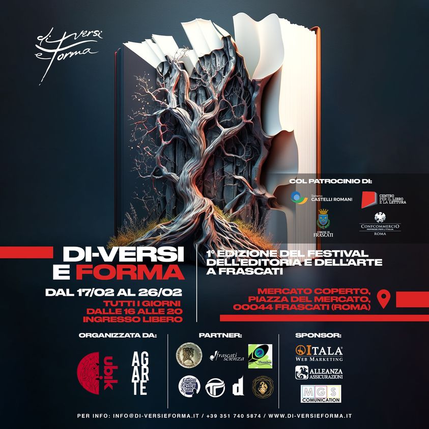Frascati – Dal 17 al 26 febbraio, presso i locali del Mercato Coperto, si svolgerà la 1° Edizione del Festival annuale dell’Editoria e dell’Arte a Frascati “Di-Versi e Forma: Editoria ed Arte a Frascati”, organizzata dall’Associazione Agarte – Fucina delle Arti e UBIK Libreria Frascati, con il patrocinio del Comune di Frascati, dalla Confcommercio di Roma, dal CEPELL e dal Sistema Bibliotecario Castelli Romani.