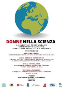 Un evento di divulgazione, aperto alla cittadinanza, che si terrà il sabato 4 febbraio, alle ore 17:00, presso le Scuderie Aldobrandini di Frascati, nel corso del quale, Paola Batistoni (responsabile Divisione sviluppo energia da fusione di ENEA), Maria Rosaria Capobianchi (già direttrice del laboratorio di virologia dell’istituto nazionale per le malattie infettive “L. Spallanzani”), Giulia Monteleone (responsabile Divisione produzione, storage e utilizzo dell’energia di ENEA) e Giovanna Pisacane (climatologa, laboratorio modellistica climatica e impatti di ENEA) dialogheranno presentando lo stato e le prospettive della ricerche su cambiamento climatico, transizione energetica e pandemie.