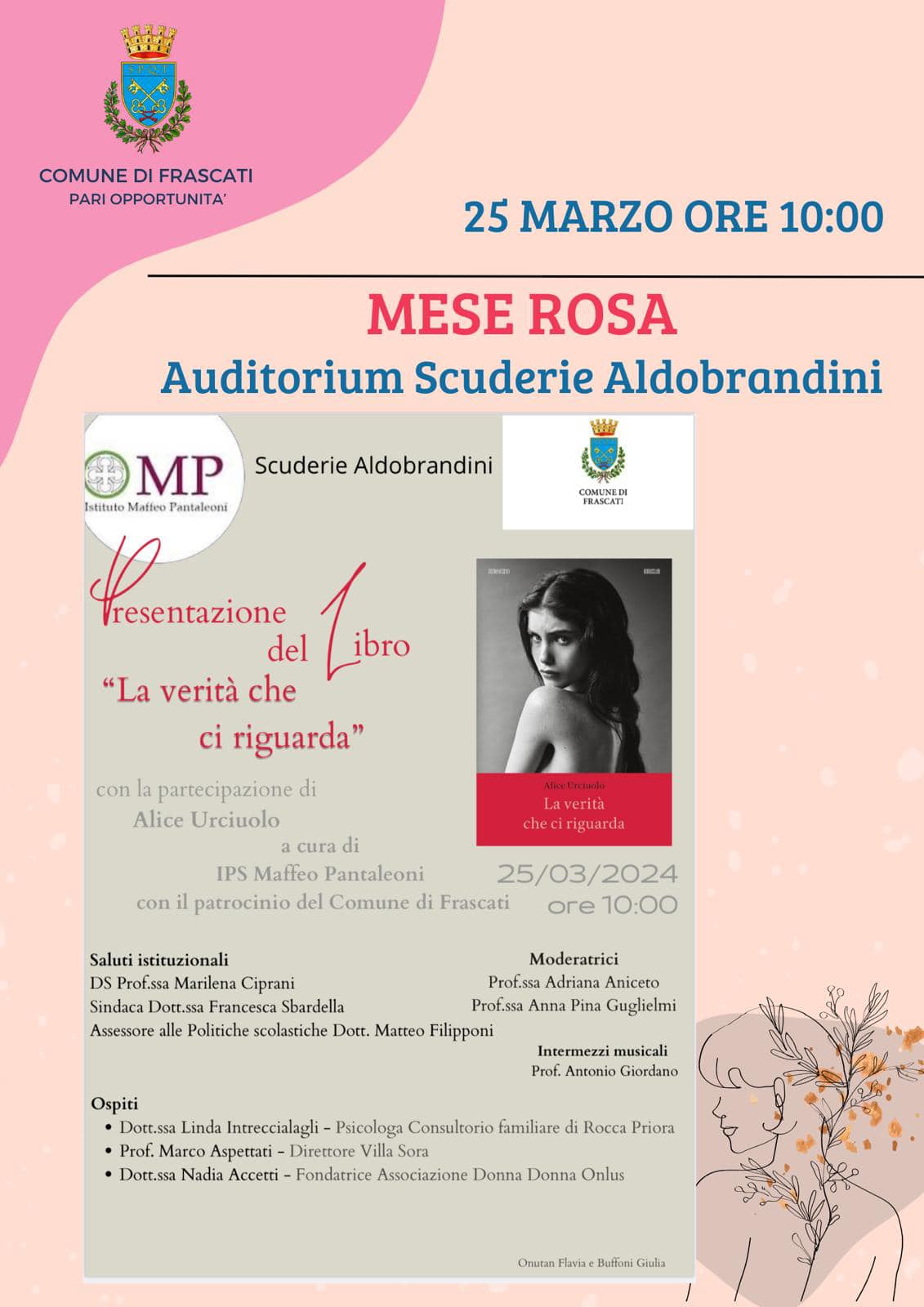 Frascati – Nell’ambito del “Mese Rosa” lunedì 25 Marzo alle Scuderie Aldobrandini di Frascati, l’IPS Maffeo Pantaleoni presenta il libro di Alice Urciolo “La verità che ci riguarda”.