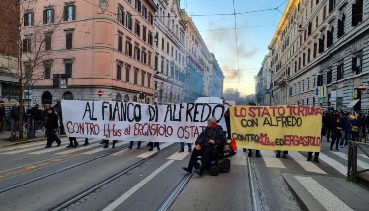 Nella piazza, presidiata dalle forze dell’ordine e interamente chiusa al traffico, sono stati esposti striscioni e manifesti contro il regime carcerario previsto per mafiosi e terroristi. Da ‘Il carcere uccide’ a ‘Al fianco di Alfredo contro 41 bis ed ergastolo ostativo’ e ‘Lo Stato tortura’. Dagli altoparlanti, musica elettronica alternata ai collegamenti con l’altra manifestazione dal penitenziario milanese – definito un “lager” dai presenti – dove è rinchiuso Cospito, da oltre 3 mesi in sciopero della fame.