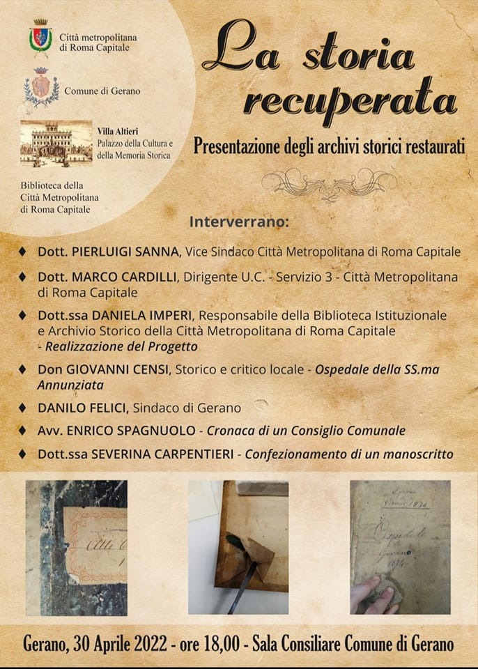 Gerano – Si terrà il 30 aprile l’evento tanto atteso nel territorio di Gerano: alle ore 18, presso la Sala Consiliare del Comune, la presentazione dei volumi storici del fondo archivistico, oggetto di uno scrupoloso lavoro di restauro, realizzato dalla Città metropolitana di Roma Capitale, in collaborazione con il comune di Gerano.