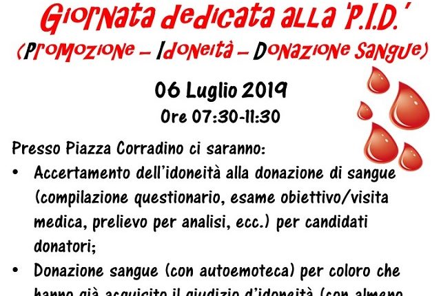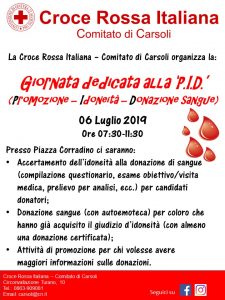 Carsoli – La Croce Rossa di Carsoli ha organizzato per il 6 luglio 2019 a Piazza Corradino, una giornata destinata all’accoglienza di nuovi donatori di Sangue.