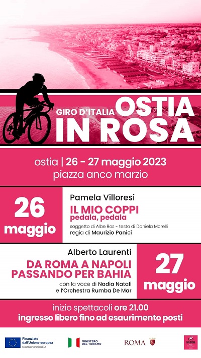 • Dal 22 al 26 maggio, il Teatro Nino Manfredi di Ostia ospiterà invece lo spettacolo teatrale “Il mio Coppi“, interpretato dall’attrice Pamela Villoresi e spettacoli gratuiti dedicati alle scuole e ai centri anziani del territorio. Ultima replica aperta a tutti in Piazza Anco Marzio, a Ostia.