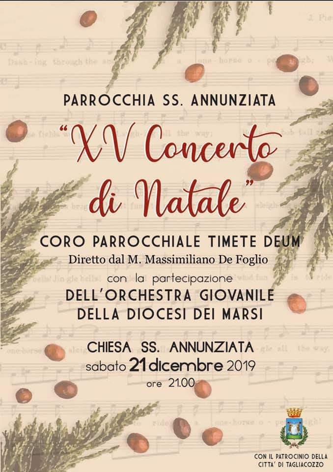 Tagliacozzo – C’è grande attesa a Tagliacozzo per la quindicesima edizione del concerto  di Natale che si svolgerà presso la suggestiva cornice della Chiesa Parrocchiale SS. Annunziata. L’appuntamento è per sabato 21 dicembre 2019 alle ore 21.00. Il Coro Timete Deum unitamente all’Orchestra giovanile della Diocesi dei Marsi darà il via ad un mix di brani che celebrano di fatto il Natale ormai alle porte.