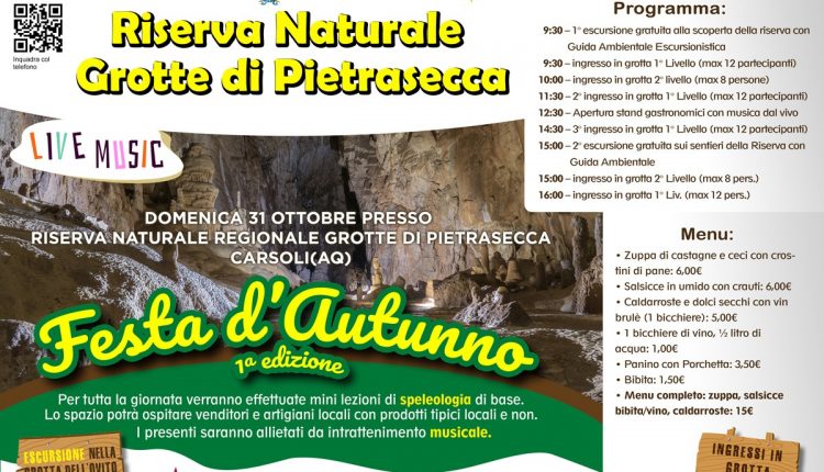 Carsoli – C’è grande attesa per domenica 31 ottobre 2021, quando protagonista sarà nuovamente la natura incontaminata della Riserva Naturale “Grotte di Pietrasecca”. La Grande festa d’autunno si preannuncia a dir poco entusiamante e suggestiva. Ci sarà spazio durante l’intera giornata per lezioni di speleologia, musica in live, escursioni nelle grotte a costo dimezzato. Una occasione unica per vivere i colori di questo periodo che sono a dir poco affascinanti.