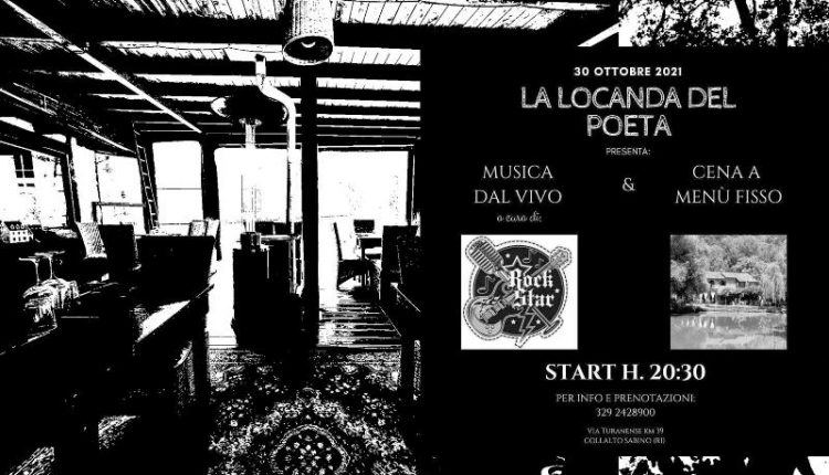 Valle del Turano – Gran serata black & white alla Locanda del Poeta. Nella suggestiva cornice della Valle del Turano l’appuntamento è per sabato 30 ottobre 2021 start h 20,00 con un mix di gusto e musica in live con la band “Rock Start”. L’evento sarà caratterizzato da una cena conviviale a menù fisso proposta dagli chef della Locanda e dall’ascolto di buona musica. Il tutto per una serata che apre di fatto le porte alla nuova stagione dei sapori d’autunno.