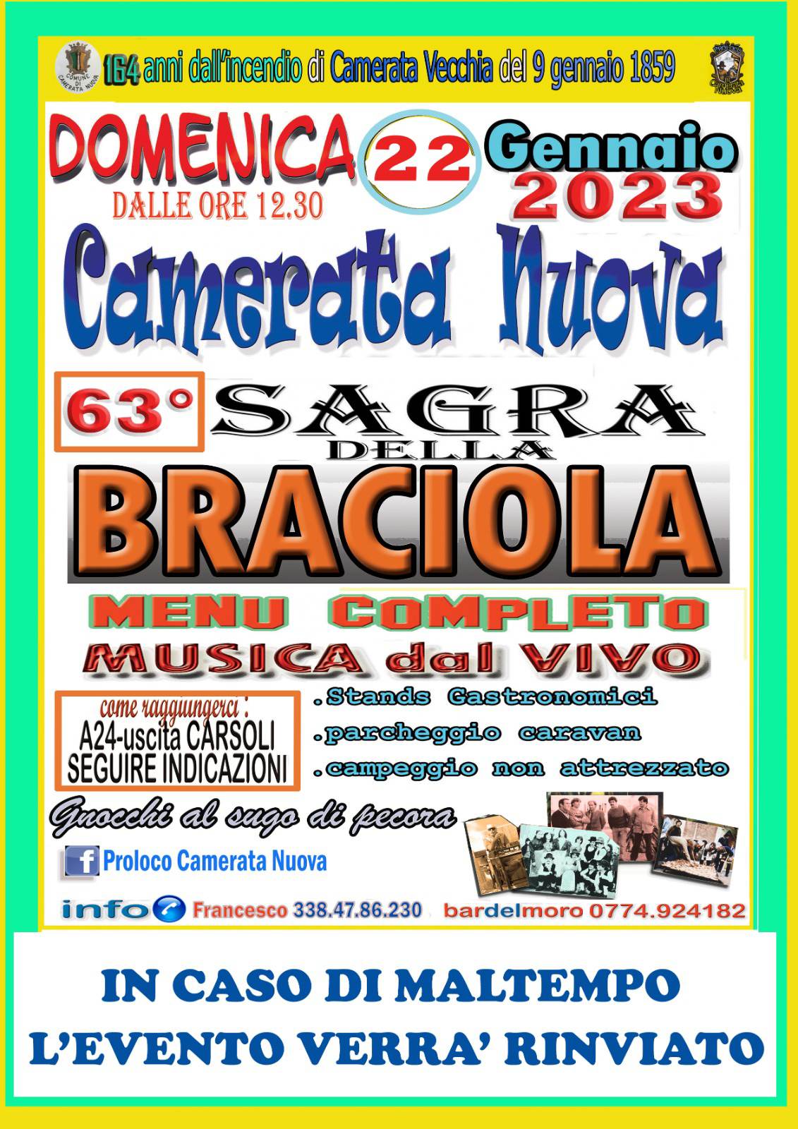 CAMERATA NUOVA – Un evento celebrativo organizzato quest’anno dalla Pro Loco con il patrocinio del Comune che si preannuncia in grande stile. Giunta alla sua sessantatreesima edizione l’appuntamento è con la sagra della Braciola: domenica 22 gennaio 2023. Un evento da non perdere e tutto da vivere in convivialità e divertimento ma anche buon gusto, musica e tanta voglia di stare insieme. Il tutto nella accogliente Camerata Nuova. Di seguito il dettaglio evento: