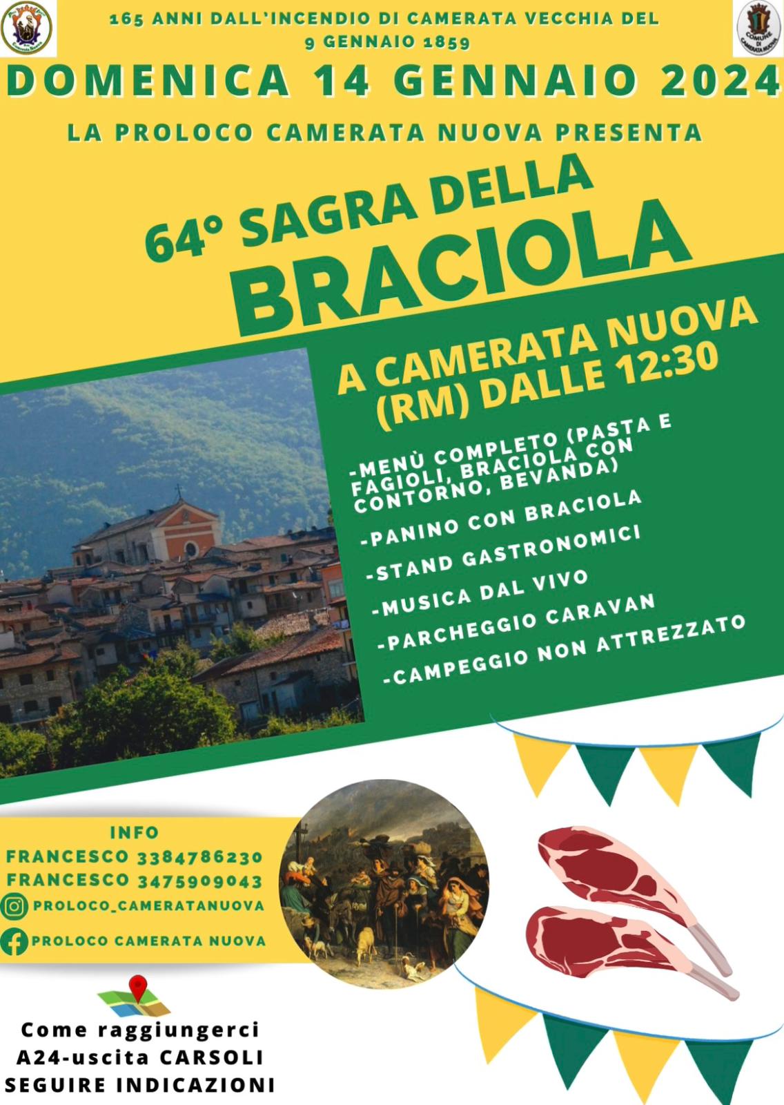 CAMERATA NUOVA – Un evento celebrativo organizzato quest’anno dalla Pro Loco con il patrocinio del comune che si preannuncia in grande stile. Giunta alla sua sessantaquattresima edizione l’appuntamento è con la sagra della Braciola: domenica 14 gennaio 2023. Un evento da non perdere e tutto da vivere in convivialità e divertimento ma anche buon gusto, musica e tanta voglia di stare insieme. Il tutto nella accogliente Camerata Nuova. Di seguito il dettaglio evento: