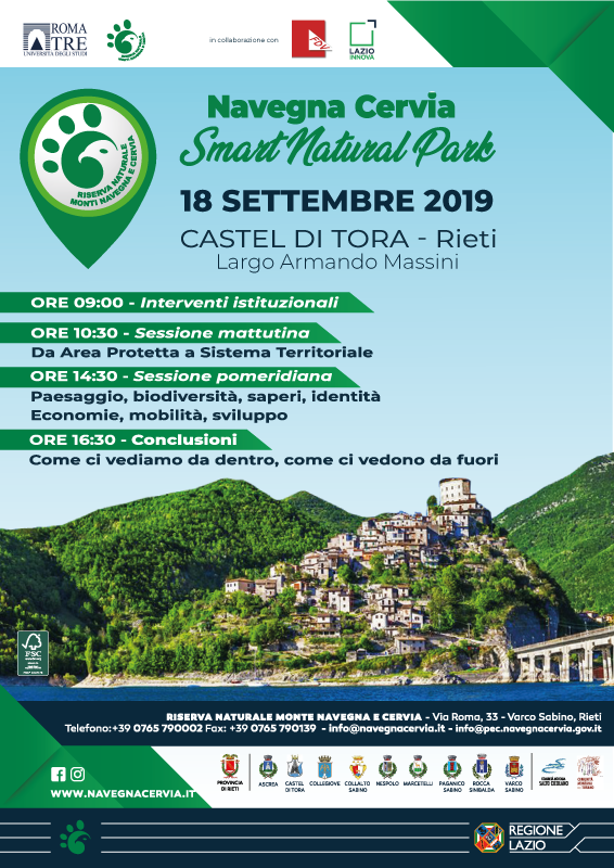Valle del Turano – Il prossimo 18 settembre dalle ore 09,00 presso la sala polifunzionale di Castel di Tora (Rieti), Largo Armando Massini, si terrà il workshop “Navegna Cervia Smart Natural Park”, organizzato dalla Riserva Naturale Monti Navegna e Cervia e dall’Università Roma Tre in collaborazione con la Fondazione Di Vittorio e Lazio Innova.