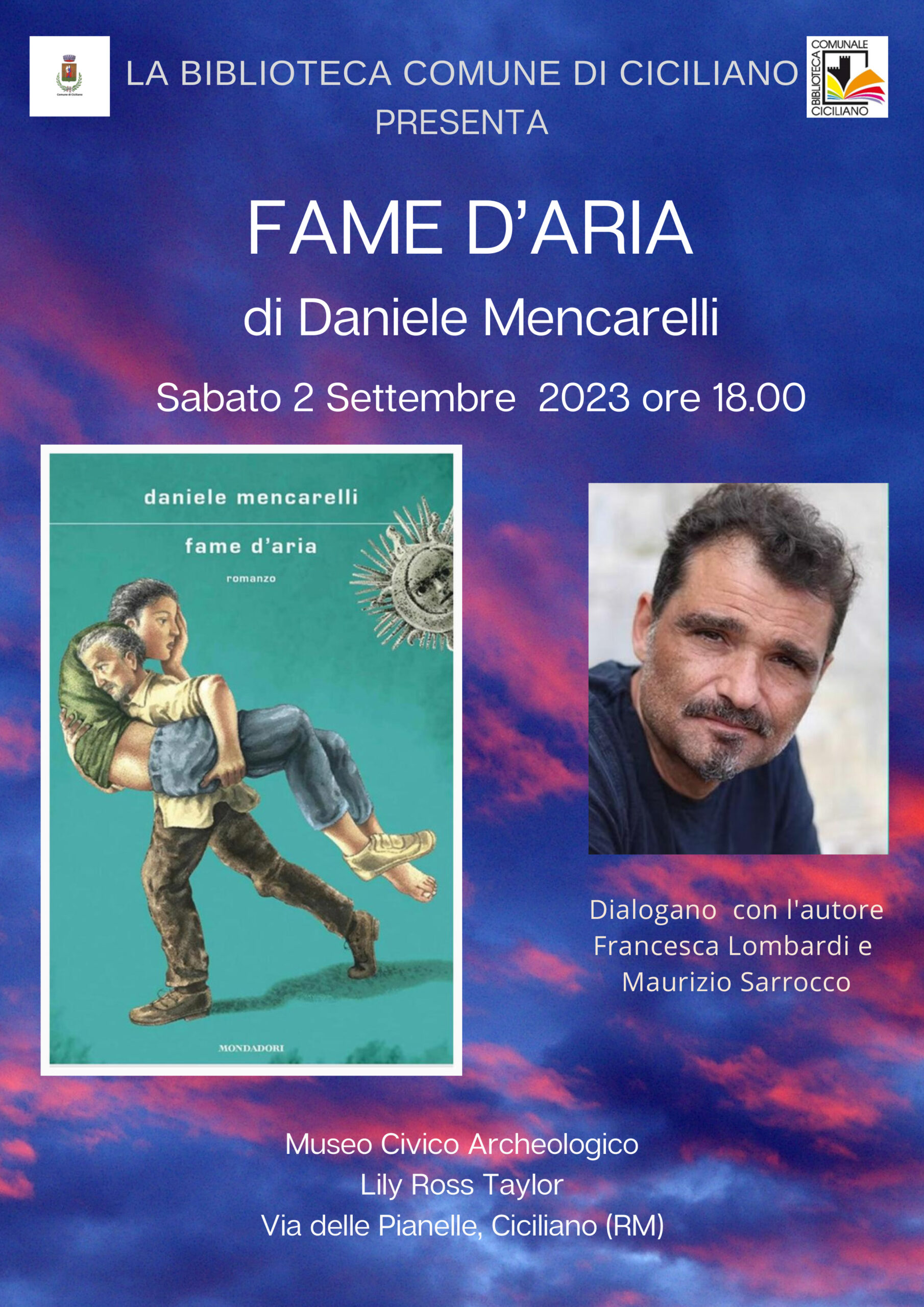 Ciciliano – C’è grande attesa per l’arrivo dell’autore Daniele Mencarelli che presenterà a Ciciliano il suo “Fame d’aria”, il nuovo romanzo che sta già riscuotendo un enorme successo. L’evento, organizzato dall’ineccepibile lavoro appassionato della biblioteca di Ciciliano, si terrà sabato 2 settembre alle ore 18 presso il Museo Civico Archeologico “Lily Ross Taylor”. Dialogheranno con l’aurore Francesca Lombardi e Maurizio Sarrocco.