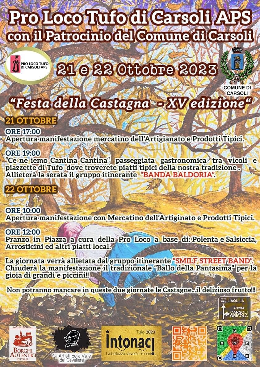 TUFO DI CARSOLI – Il borgo delle arti si prepara dunque per l’evento giunto alla sua quindicesima edizione: la festa della castagna. Un modo per stare insieme e dare il benvenuto all’autunno, ai suoi colori ed ai suoi sentori tra gusto, musica e tanta voglia di stare insieme. L’appuntamento è per sabato 21 e domenica 22 ottobre 2023 con un programma d’eccellenza. Nella domenica 22 ottobre è stata organizzata anche la festa medievale alla Riserva naturale speciale Grotte di Pietrasecca, occasione per vivere una molteplicità di aspetti nel comprensorio zonale. Di seguito i dettagli degli eventi. La festa della castagna è organizzata dalla Pro Loco di Tufo, con il patrocinio del comune di Carsoli.