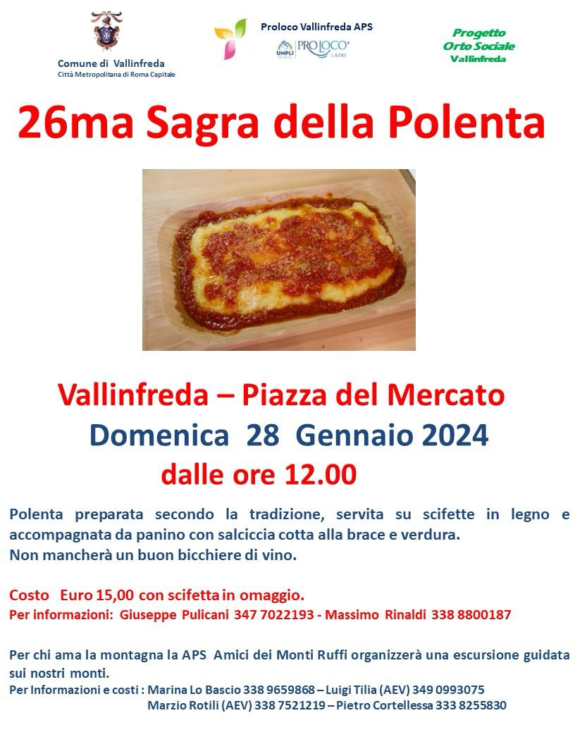 VALLINFREDA – Buongusto, convivialità, tradizione e tanta voglia di stare insieme. Il bellissimo borgo di Vallinfreda si tinge di giallo, il colore del mais e della polenta che sarà protagonista per la ventiseiesima edizione della “Sagra della Polenta”. L’organizzazione è curata dalla Pro Loco, in collaborazione con il comune di Vallinfreda ed il progetto Orto Sociale. E la scifetta dopo la degustazione  è omaggio!