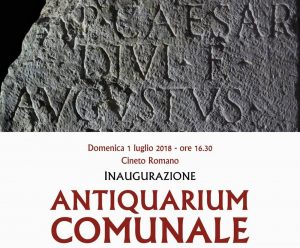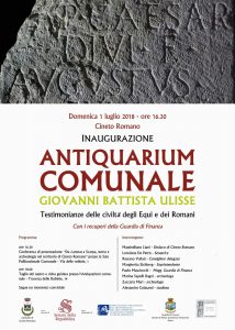 Cineto Romano – C’è grande attesa in Valle Aniene per un interessante progetto di cui è protagonista la realtà di Cineto Romano. Domenica 1° luglio 2018, infatti presso la Sala Polivalente del Comune di Cineto, sarà inaugurato l’Antiquarium Comunale “G.B. Ulisse”, testimonianze storico culturali delle cività degli Equi e dei Romani. L’evento è stato patrocinato dal Senato della Repubblica, che sarà rappresentato dalla senatrice Loredana de Petris. Dopo una conferenza di presentazione presieduta dal Sindaco Massimiliano Liani, si seguirà un percorso guidato, un momento conviviale in una serie di relazioni di esperti e cattedratici di settore.