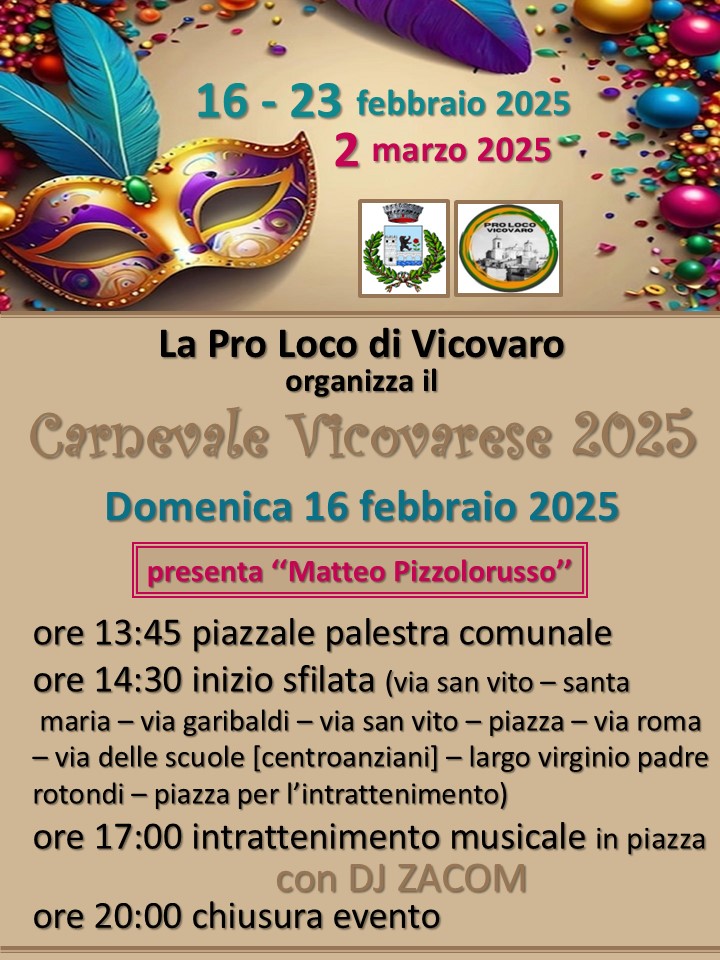 VICOVARO  – Si parte domenica 16, poi a seguire altre date: 23 febbraio e 2 marzo: piazza San Pietro e le vie del borgo saranno interessate dal tradizionale carnevale vicovarese. Domenica 16 febbraio save the date con il primo appuntamento: di seguito la locandina con i dettagli del programma