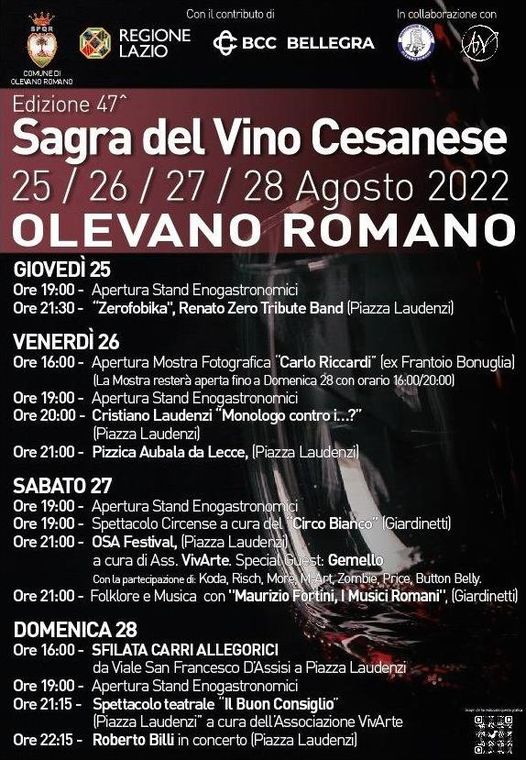 OLEVANO ROMANO – C’è grande attesa ed è tutto pronto per la quarantasettesima edizione della Sagra del Vino Cesanese. Quattro giorni di convivialità, cultura enogastronomica e celebrazione del vino prodotto tipico con spettacoli, degustazioni etc. Di seguito il dettaglio evento: